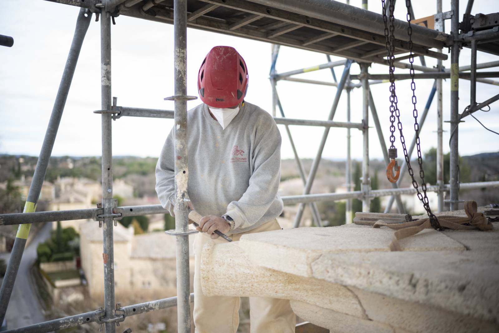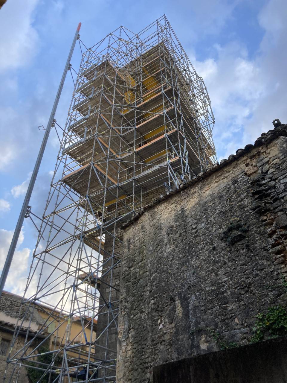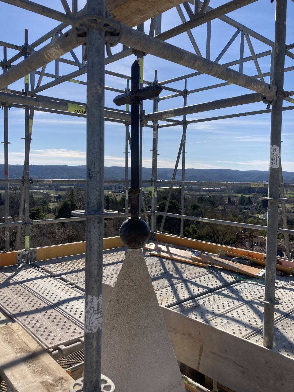 Restauration du clocher de Vers Pont du Gard après avoir été frappé par la foudre.